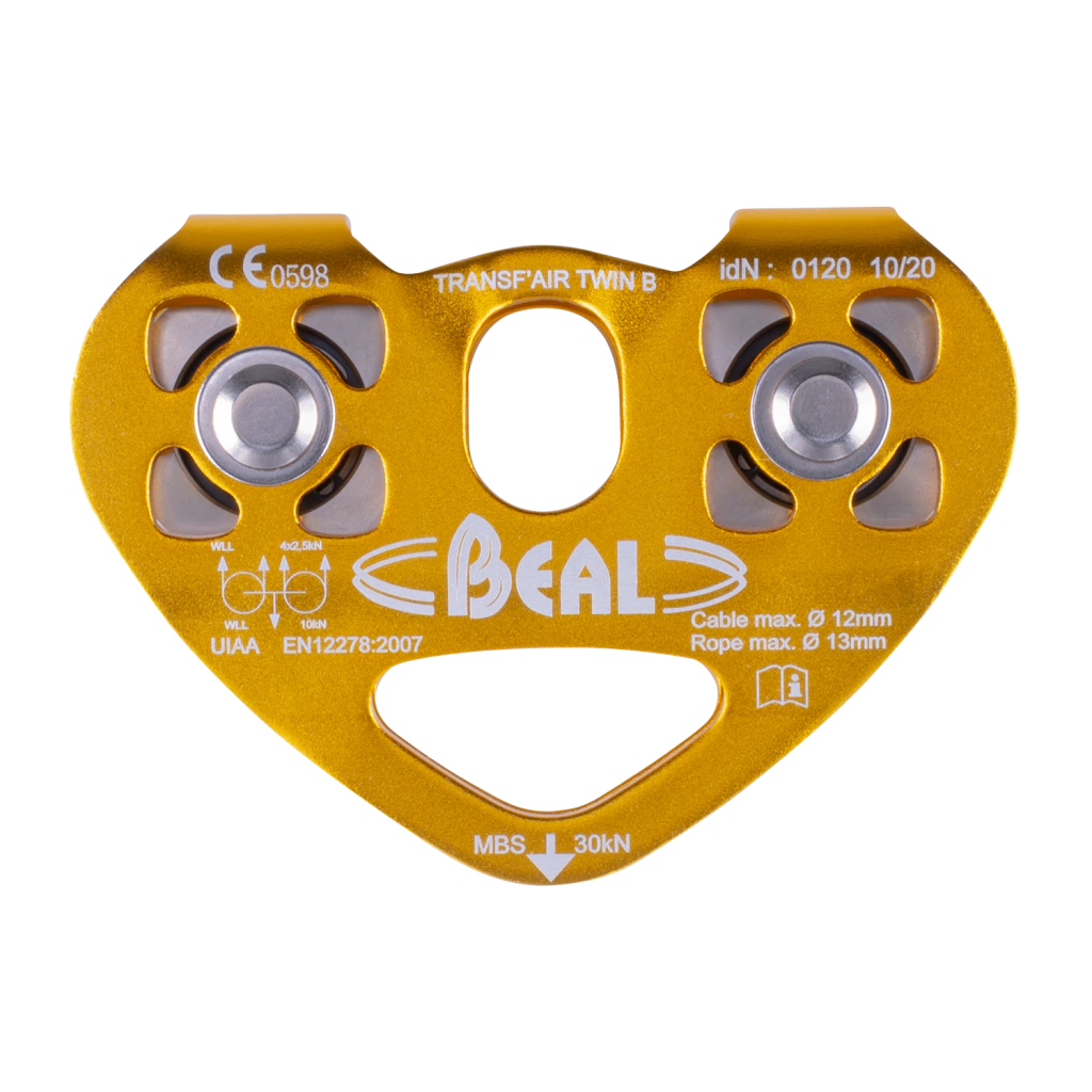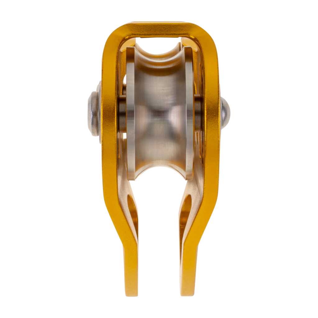 Polea doble con dos roldanas de acero inoxidable montadas en línea con rodamientos de bolas, diseñada para un uso intensivo en tirolinas de cuerda o cable de acero